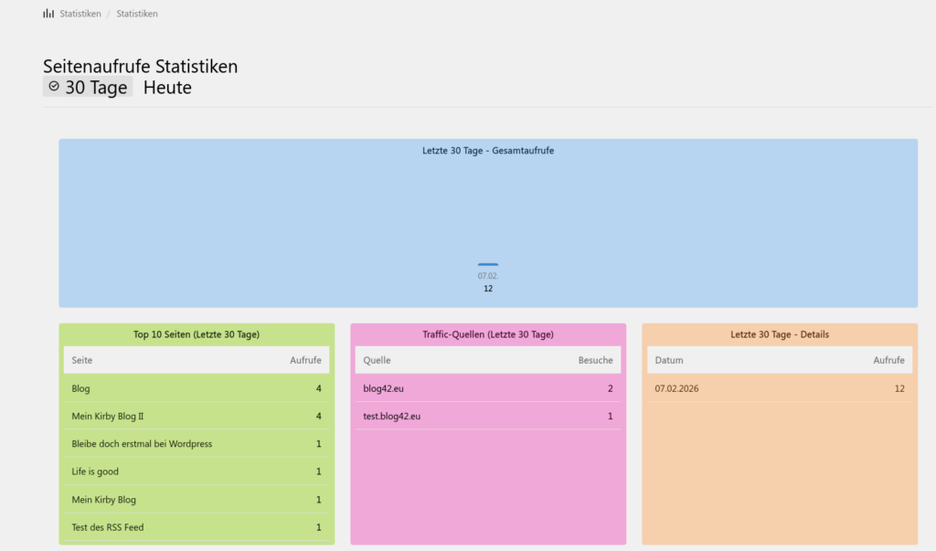 Mein Kirby Blog II 7. Februar 2026 / Wolfgang / Keine Kommentare Mein Kirby Blog hat jetzt auch eine einfache Statistik. Das Statistik Plugin wurde zusammen mit Claude erstellt. Kategorien: Webentwicklung Schlagwörter: Blog, Claude, Kirby, Plugin